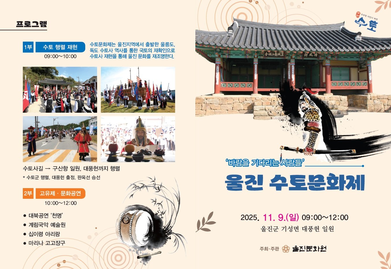 [아시아월드뉴스] 울진군은 오는 11월 9일 기성면 대풍헌 일원에서 조선시대 울릉도·독도 수호를 위해 파견되었던 수토사의 숭고한 정신을 기리는 ‘2025 울진 수토문화제’를 개최한다.
