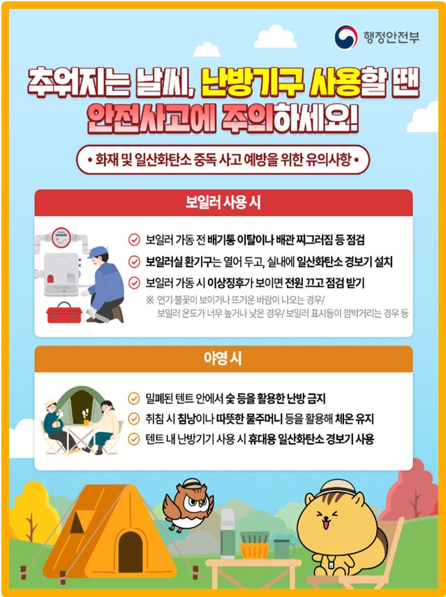 황기연 예방정책국장은 “보일러를 사용하기 전에는 이상 유무를 꼼꼼히 점검하고 사용 중에도 주기적으로 살피는 습관이 중요하다”며, “캠핑 시에도 난방용품을 사용할 때는 환기에 각별히 주의해 안전하게 캠핑을 즐기시길 바란다”고 말했다.