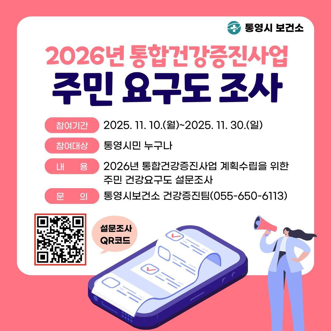 [아시아월드뉴스] 통영시는 2026년 통합건강증진사업의 효과적이고 실효성 있는 추진을 위해 오는 10일부터 30일까지 3주간 ‘통합건강증진사업 주민요구도 조사’를 실시한다.