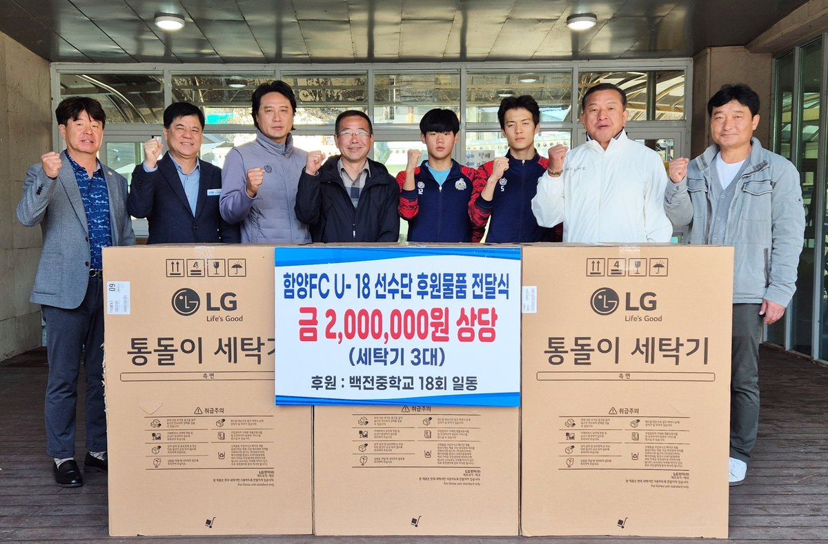 이날 장성현 백전중학교 제18회 동창회 회장, 안병명 군체육회장, 정명호 함양FC 후원 회장, 조영화 백전면장 등이 백전면 소재 선수단 숙소를 방문, 왕정현 수석코치 등 함양FC 축구 관계자에게 세탁기 3대를 전달했다.