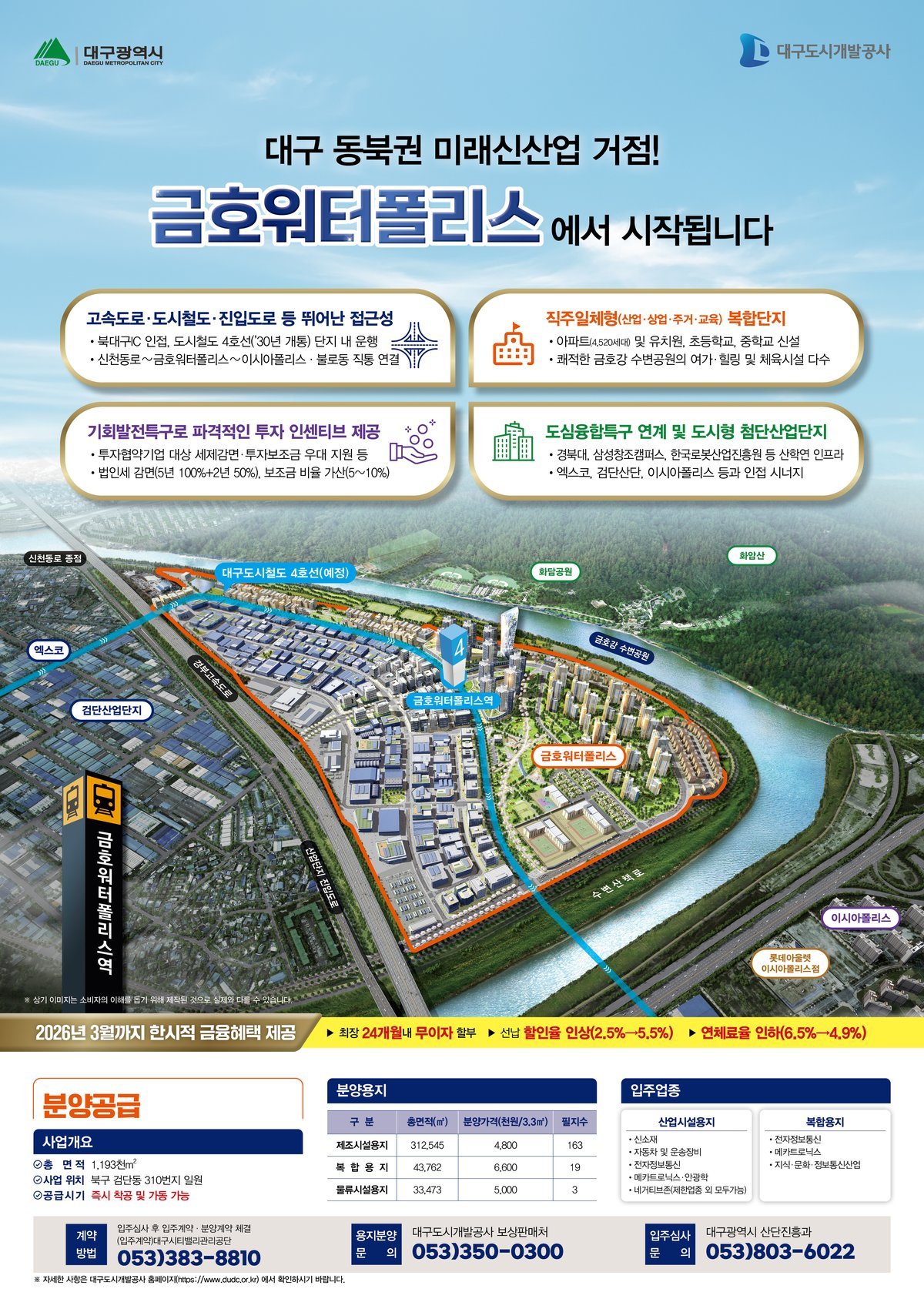 [아시아월드뉴스] 대구광역시는 미래 첨단산업 육성의 동북권 클러스터 거점인 율하도시첨단산업단지와 금호워터폴리스에 대한 분양설명회 개최에 이어 이달 4일 공급공고를 시작으로 본격적인 분양에 돌입했다.