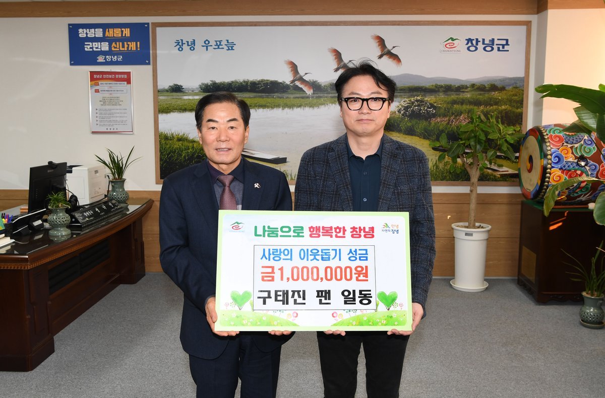 [아시아월드뉴스] 창녕군은 지난 9일 싱어송라이터 구태진 씨의 팬 일동이 군민들을 위해 사용해 달라며 성금 100만 원을 기탁했다고 밝혔다.