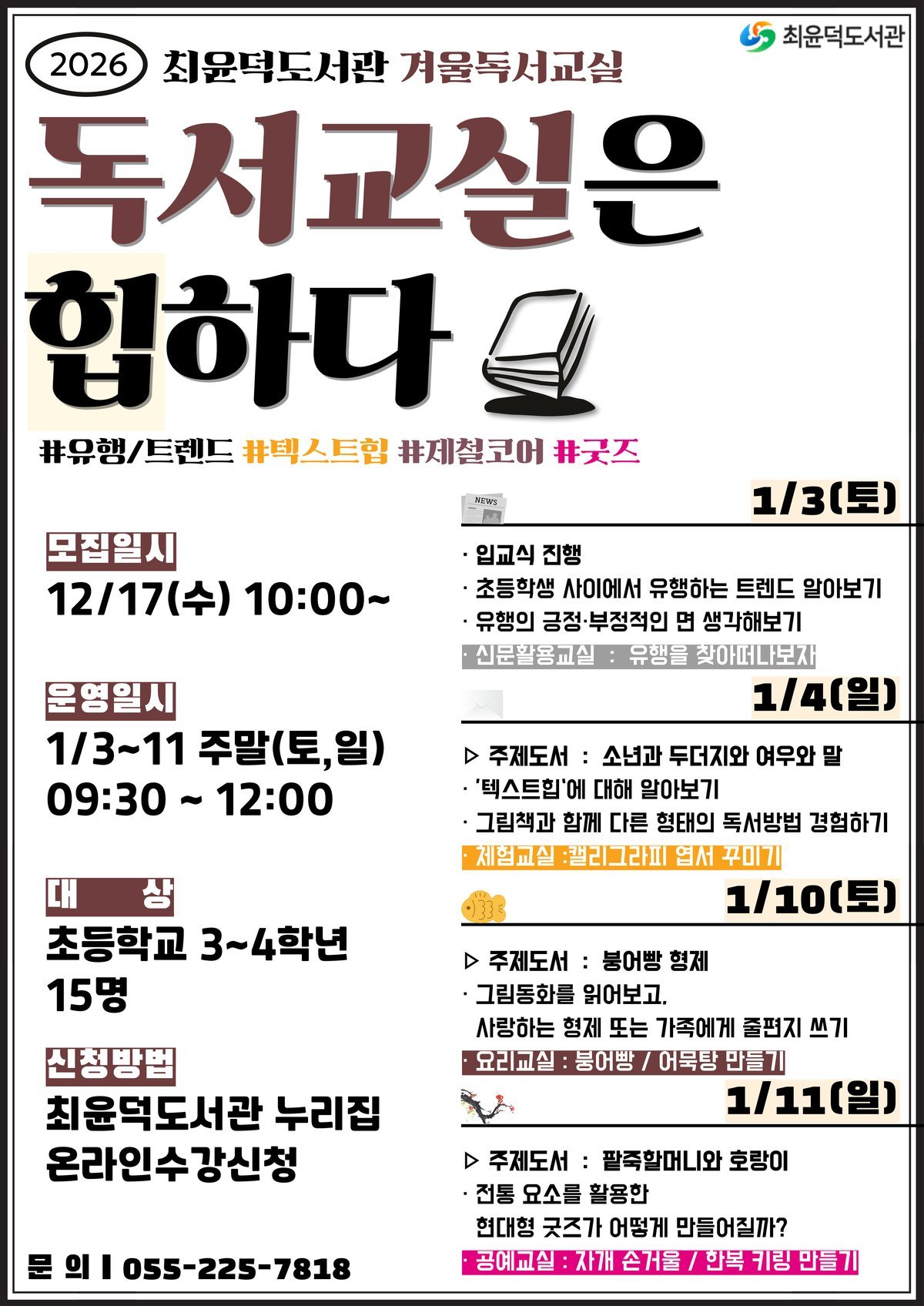 [아시아월드뉴스] 창원특례시 최윤덕도서관에서는 오는 1월 3일부터 11일까지 주말 4일간 초등학교 3~4학년을 대상으로 겨울독서교실을 운영한다.