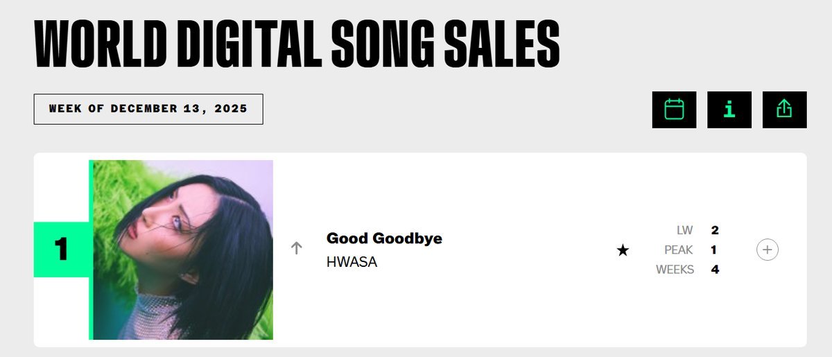 화사의 ‘Good Goodbye’는 10일 공개된 12월 13일자 ‘빌보드 코리아 핫100’에서 지난주에 이어 또다시 정상에 올랐다.