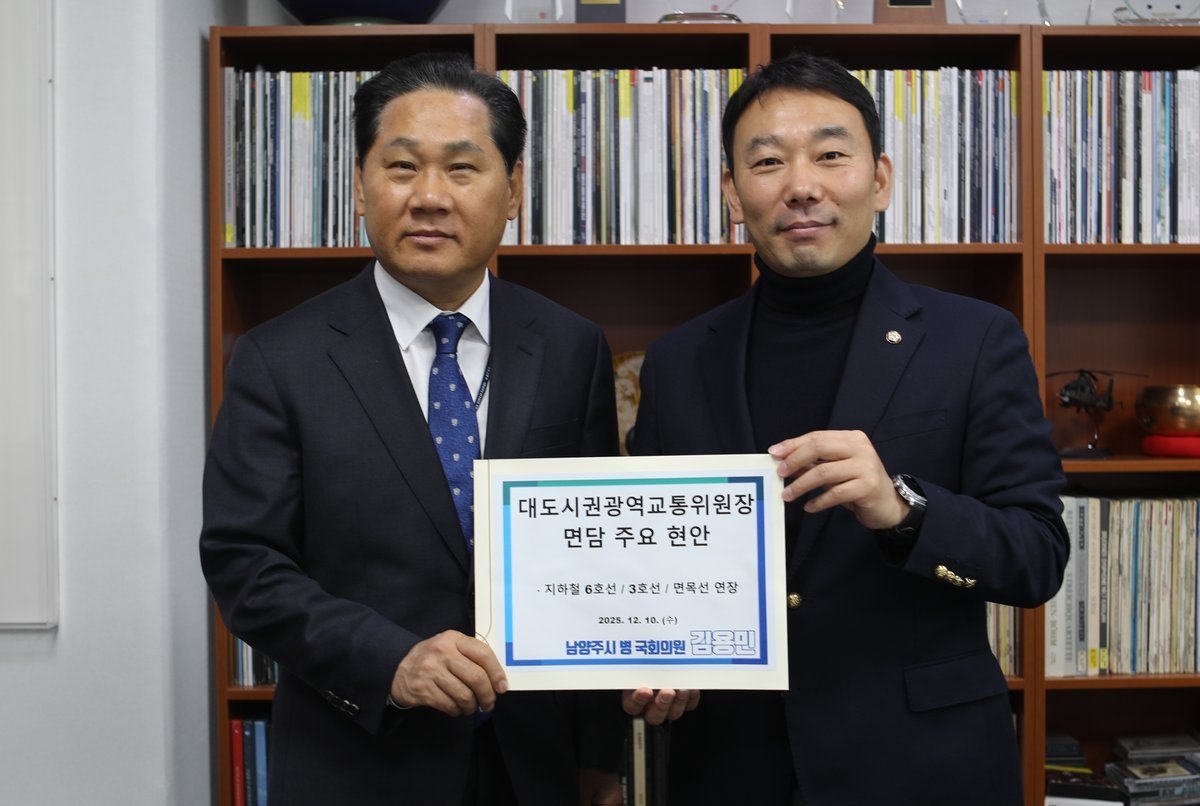 [아시아월드뉴스] 더불어민주당 김용민 국회의원은 오늘 국토교통부 대도시권광역교통위원회 위원장을 만나 △지하철 6호선 남양주 연장 △지하철 3호선 남양주 연장 △면목선 남양주 연장 등 남양주 핵심 철도 현안에 대해 집중 논의하고, 제5차 대도시권 광역교통 시행계획에의 반영과 대광위의 적극적인 권한 행사 및 조정 역할을 강력히 요청했다.