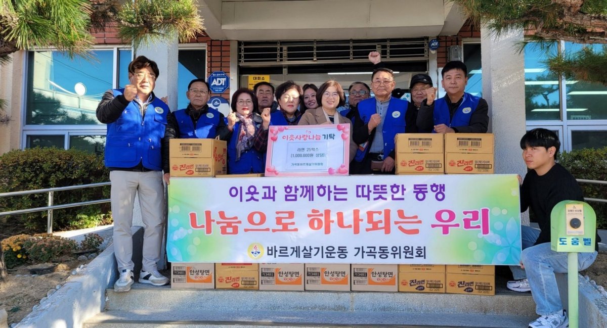 [아시아월드뉴스] 밀양시 바르게살기운동 가곡동위원회는 10일 지역 내 소외계층을 돕기 위해 가곡동 행정복지센터를 방문해 100만 원 상당의 라면 25박스를 기탁했다.