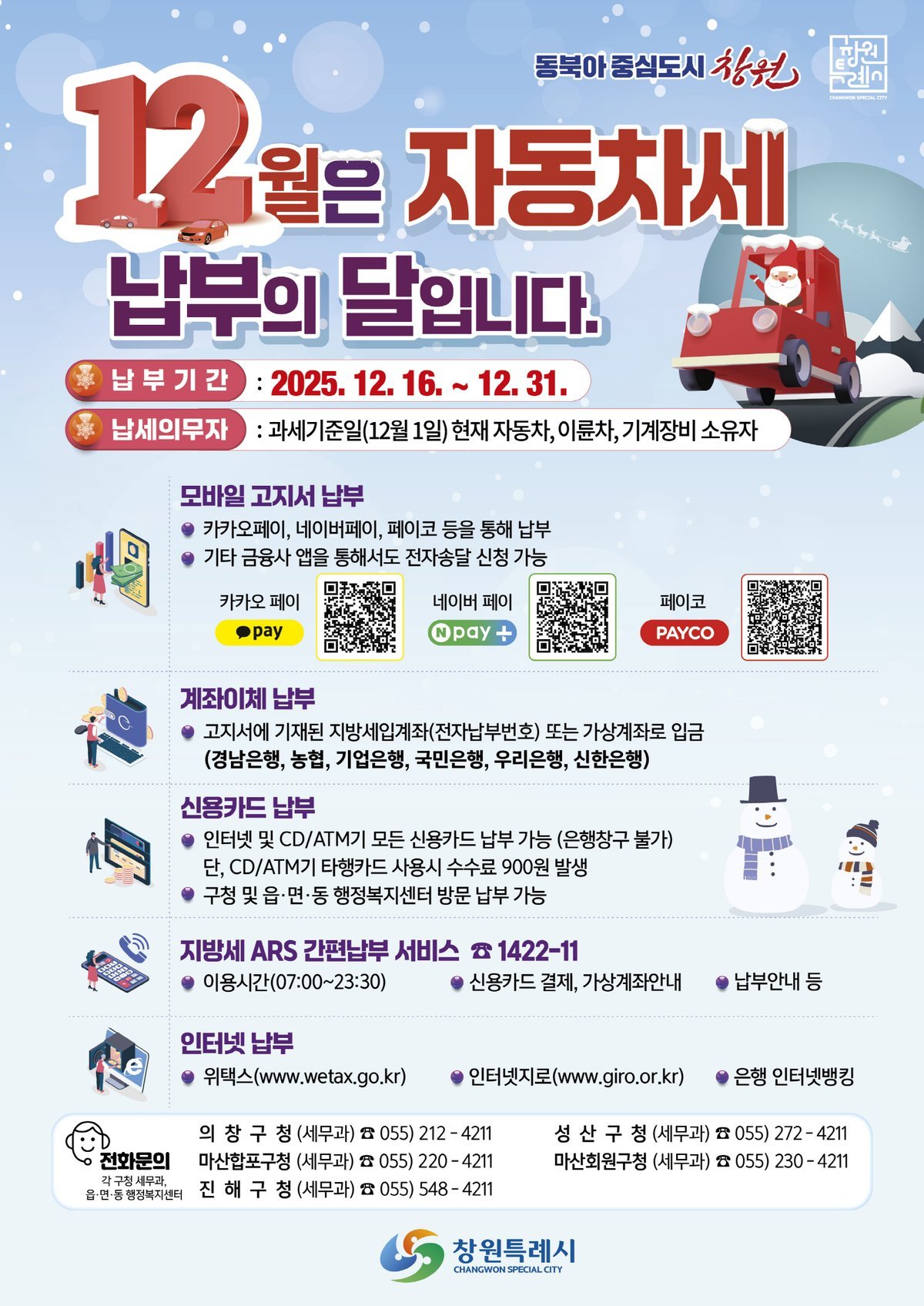12월 제2기분 자동차세는 과세기준일인 12월 1일 현재 창원시에 등록된 자동차, 이륜자동차, 기계장비의 소유자에게 부과된다.