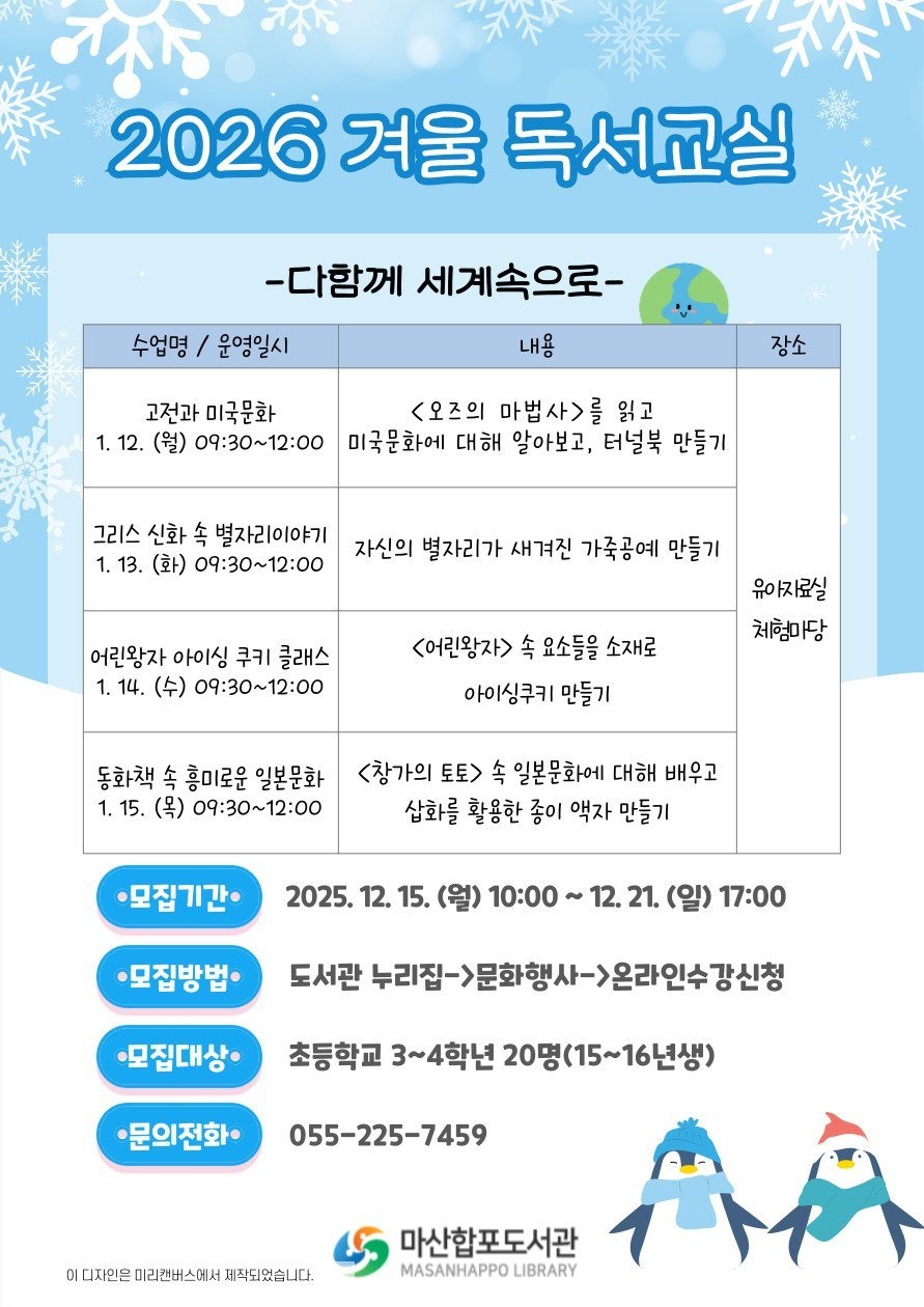 [아시아월드뉴스] 창원특례시 마산합포도서관은 오는 2026년 겨울 독서교실을 1월 12일부터 15일까지 4일간 운영한다.