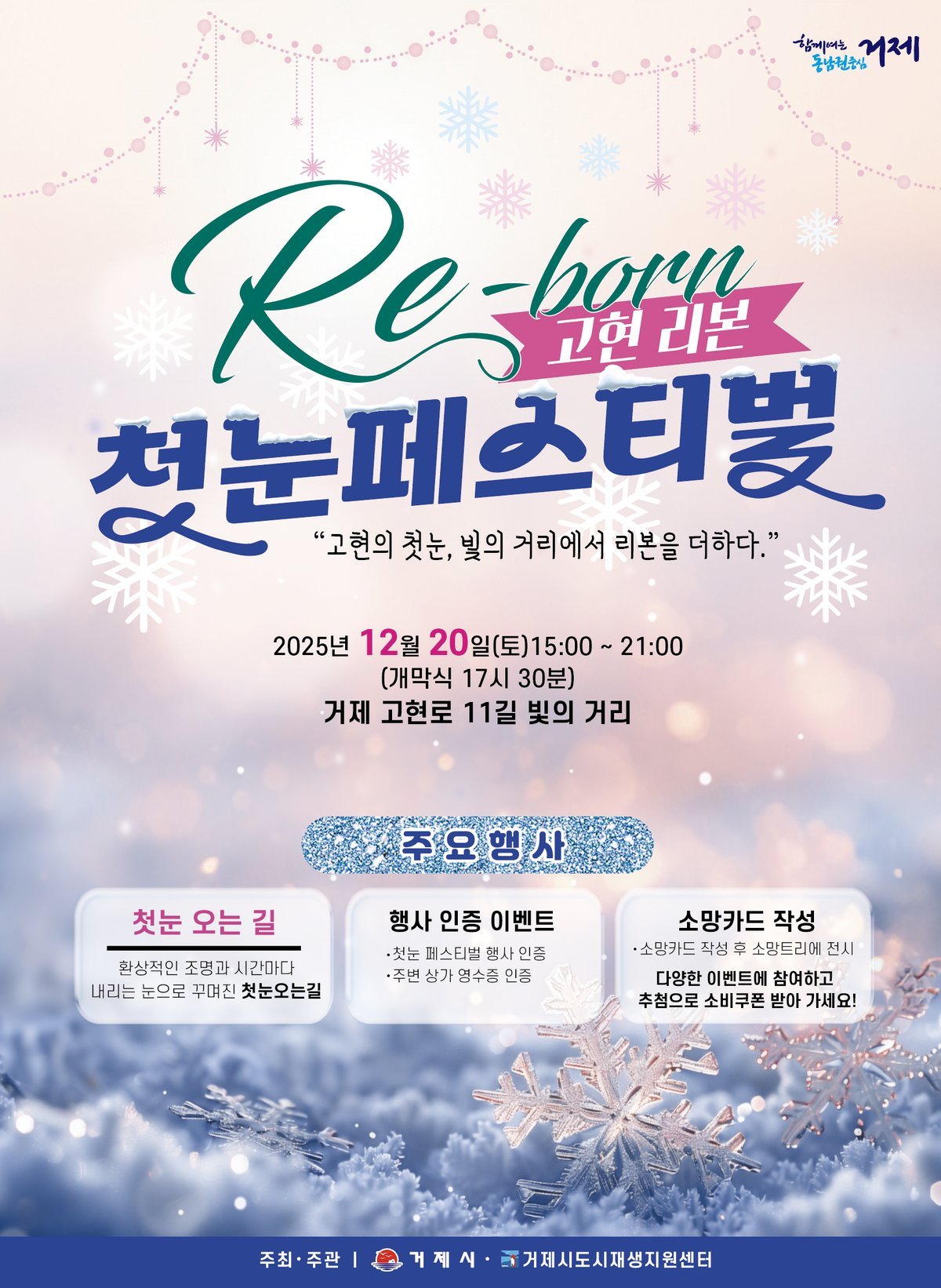 거제시 관계자는 “첫눈이 내리는 겨울 거리의 분위기를 도심에서 즐길 수 있도록 준비했다”며, “이번 축제를 통해 고현 빛의 거리와 주변 상권에 활력이 더해지길 바란다”고 말했다.