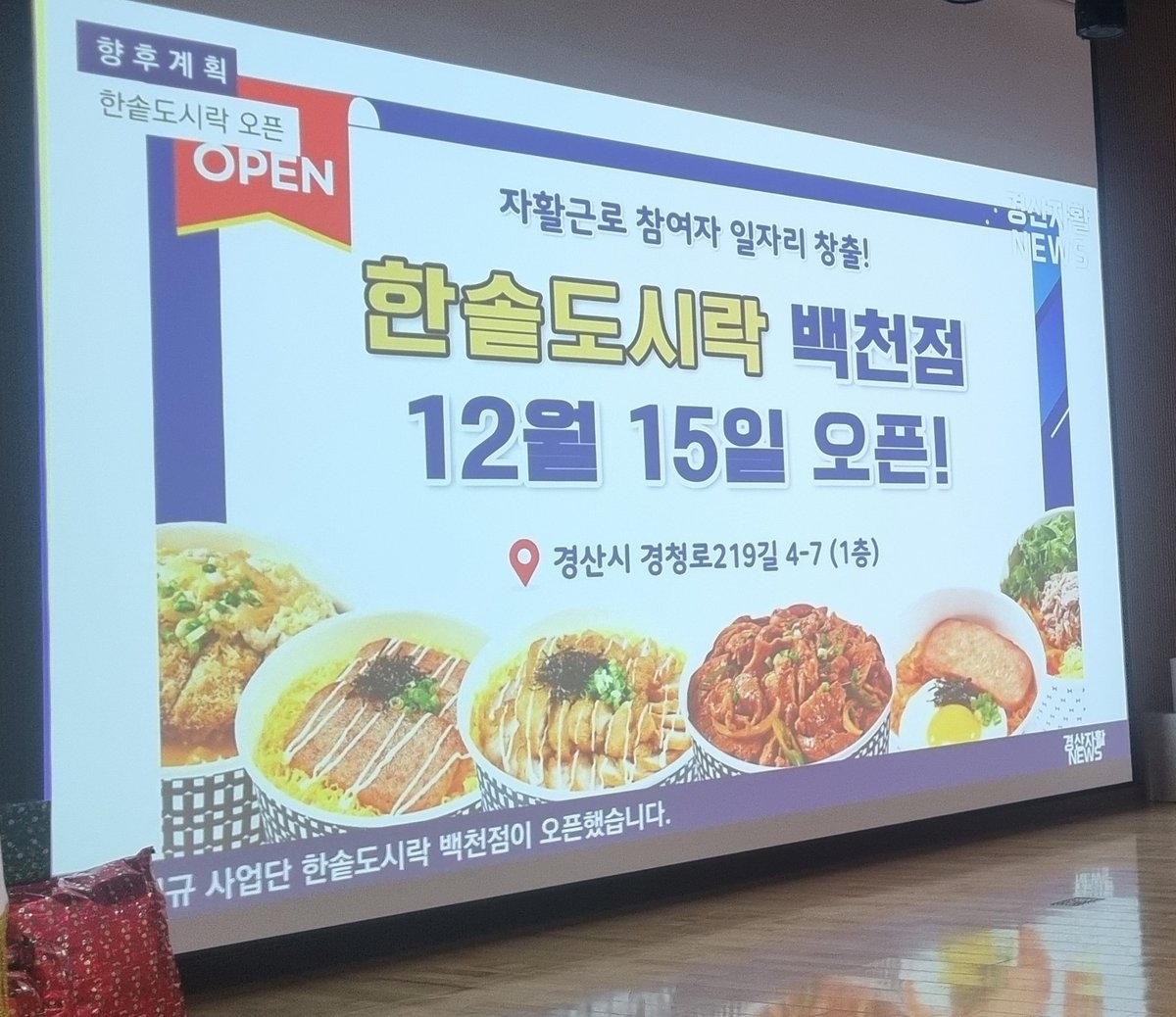 [아시아월드뉴스] 경북경산지역자활센터는 15일 지역 주민의 자립과 경제활동 참여 기회 확대를 위하여 신규 자활근로사업단 「한솥도시락 경산 백천점」을 오픈했다.
