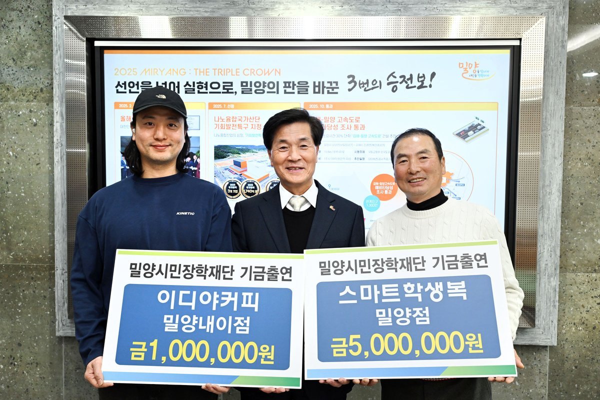 [아시아월드뉴스] 밀양시민장학재단은 15일 스마트학생복에서 500만원, 이디야커피 내이동점에서 100만원을 각각 기탁받았다.