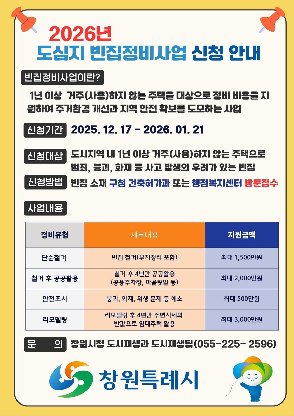 [아시아월드뉴스] 12월 17일부터 내년 1월 21일까지 접수 창원특례시는 도심지 빈집 문제를 해소하기 위해 예산을 대폭 확대해 ‘2026년 도심지 빈집정비사업’을 추진한다고 밝혔다.