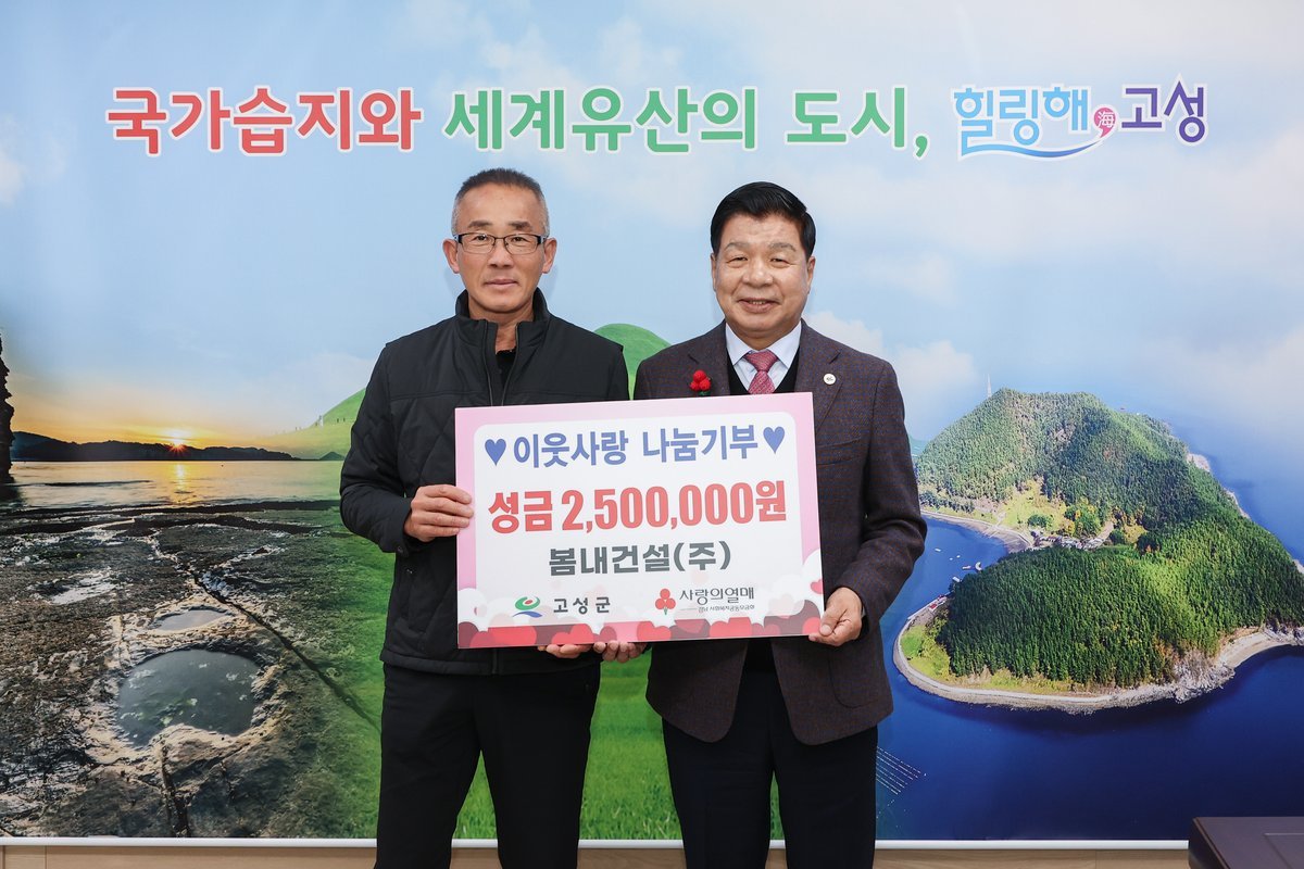 [아시아월드뉴스] 고성군 우산리 소재 봄내건설 조춘룡 이사는 12월 15일 고성군청을 방문하여 군내의 어려운 이웃을 위해 써 달라며 이웃돕기성금 250만 원을 전달했다.