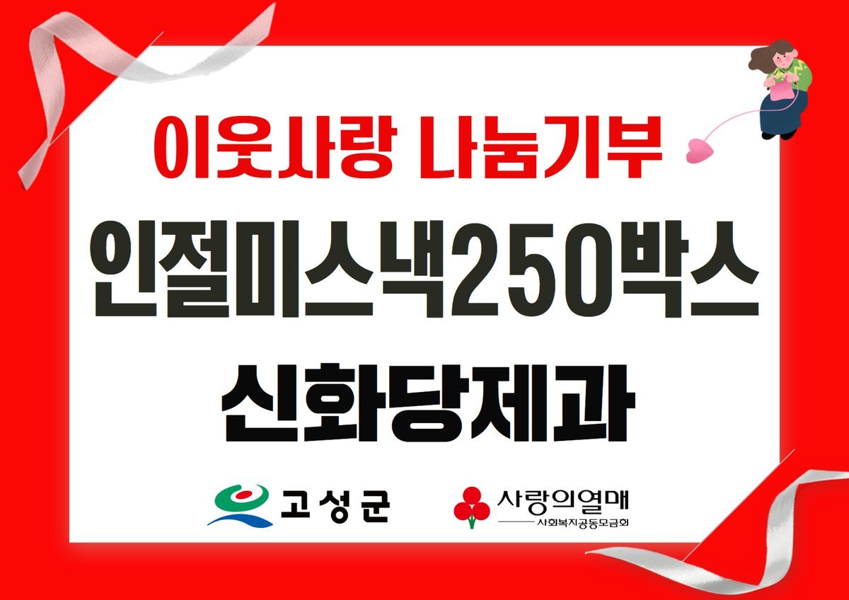 [아시아월드뉴스] 고성읍 소재 신화당제과는 12월 12일 어려운 이웃을 위해 써달라며 인절미 스낵 250박스를 전달했다.