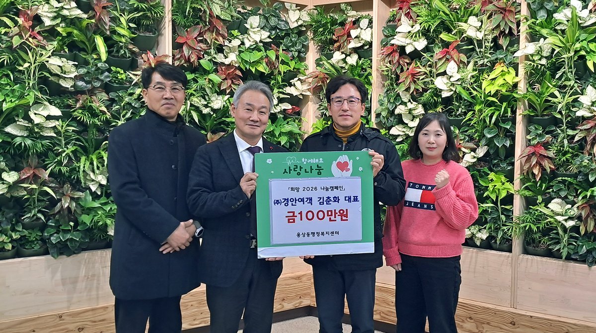 [아시아월드뉴스] 안동시 ㈜경안여객은 12월 16일 용상동행정복지센터를 방문해 소외된 이웃들에게 사랑과 희망을 전달하고자 ‘희망 2026 나눔캠페인’릴레이에 동참하며 100만 원을 기탁했다.