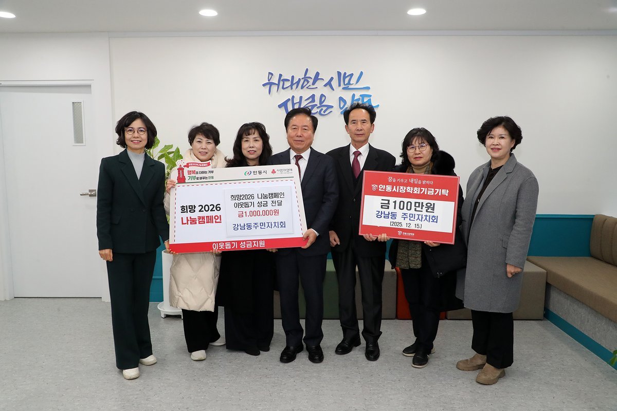 강남동 주민자치회는 12월 15일 안동시청 시장실을 방문해, 관내 어려운 이웃을 위한 성금 100만 원과 지역 인재 육성을 위한 안동시 장학기금 100만 원, 총 200만 원을 기탁했다.