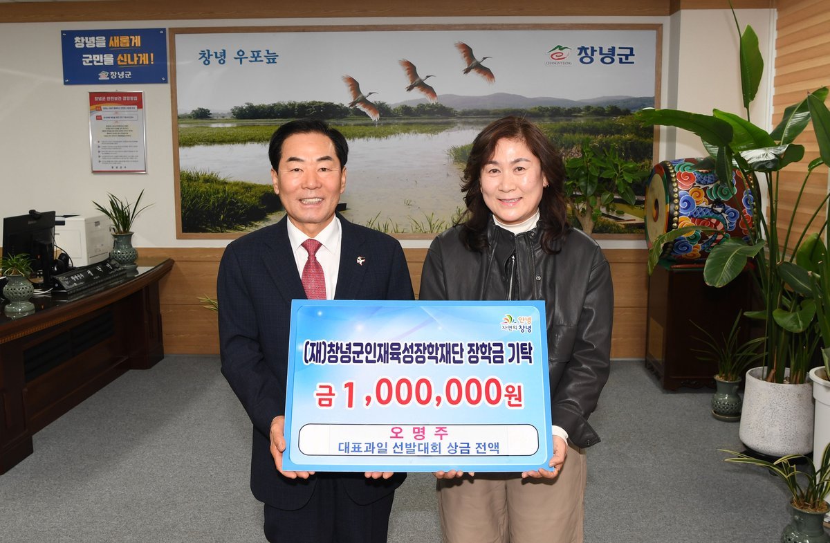 [아시아월드뉴스] 창녕군은 지난 16일 길곡면 천복농원 오명주 대표가 ‘대한민국 대표과일 선발대회’에서 받은 상금 100만 원을 지역 인재 육성을 위해 창녕군인재육성장학재단에 기탁했다고 밝혔다.