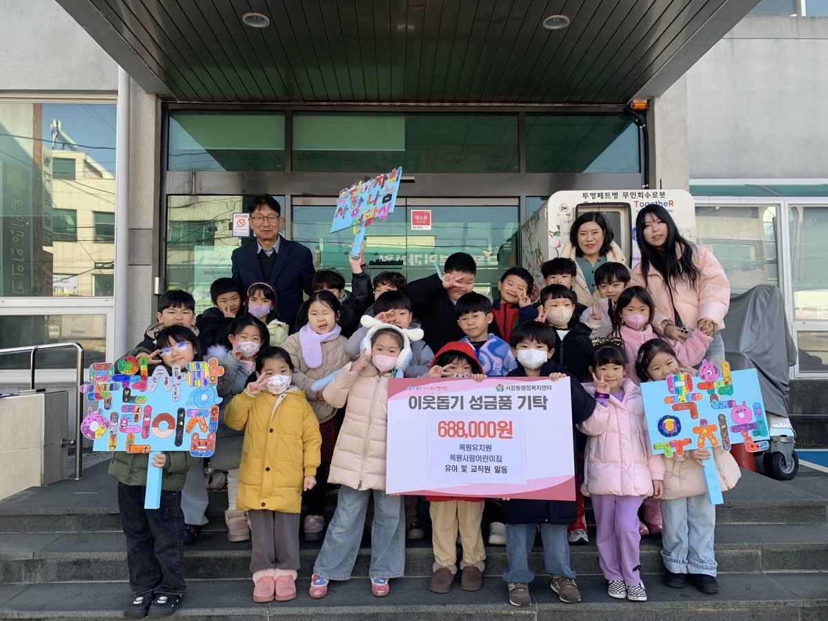 송봉현 서창동장은 “원생들의 어려운 이웃을 돕고자하는 마음에 감동했고, 이웃사랑에 동참해주신 목원유치원 원장님과 직원분들께 깊은 감사를 드린다”며 “아이들의 정성이 담긴 마음을 도움이 필요한 이웃에게 잘 전달하겠다”고 전했다.