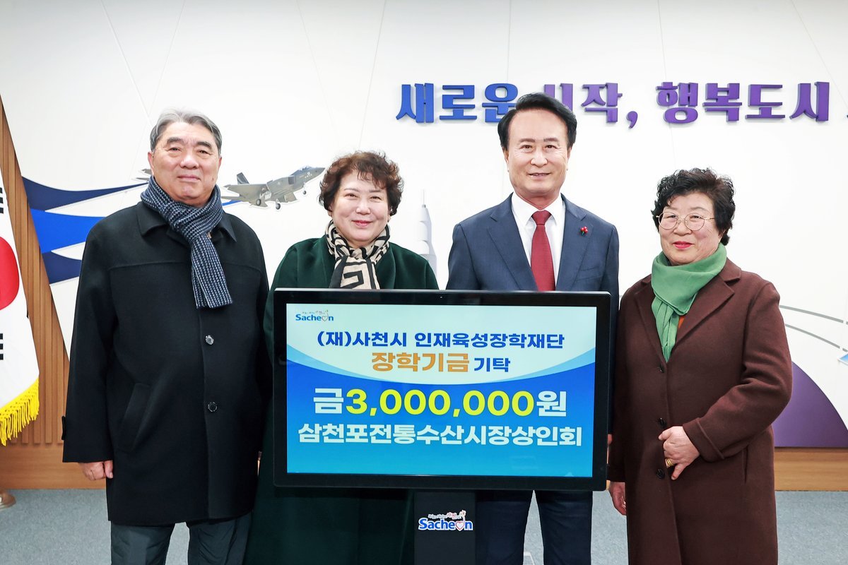 [아시아월드뉴스] 삼천포전통수산시장상인회는 지난 16일 사천시청을 방문해 사천시 인재육성장학재단에 지역 인재 육성을 위한 장학금 300만 원을 전달했다.