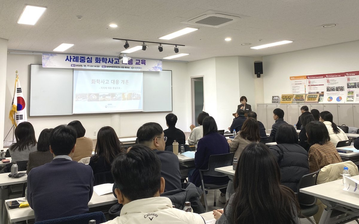 교육에는 구청·읍·면·동 환경담당 공무원과 소방공무원, 재난안전 부서 공무원 등 약 50여 명이 참석했으며, 다수의 사고 대응 경험을 보유한 기후에너지환경부 화학물질안전원 전문 연구사님들이 실제 화학사고 사례 중심으로 지자체 역할 등에 대해 수준 높은 실무 중심 강의를 진행했다.