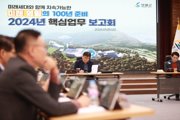 [AANEWS] 영월군은 1월 5일 군청 대회의실에서 부서장, 팀장 및 실무자가 참여한 가운데 “미래세대와 함께 지속가능한 미래영월의 100년”의 비전을 담은 2024년 핵심업무 및 신규 시책 보고회를 개최했다.