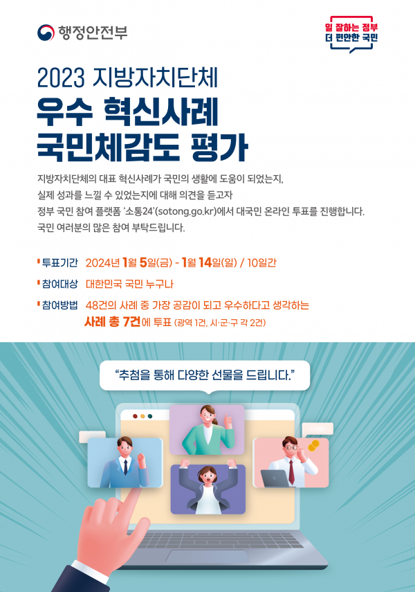 한편 국민체감도 평가와 혁신역량 및 혁신성과 평가결과를 합산해 오는 2월 ‘2023년 지방자치단체 혁신평가’ 우수지자체를 선정할 계획이다.