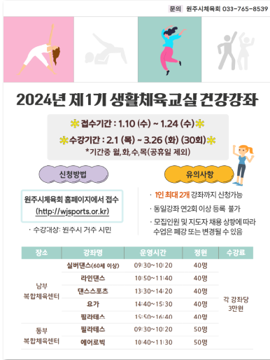 [AANEWS] 원주시와 원주시체육회가 오는 10일부터 24일까지 ‘2024년 제1기 생활체육교실’ 건강강좌 수강생을 모집한다.