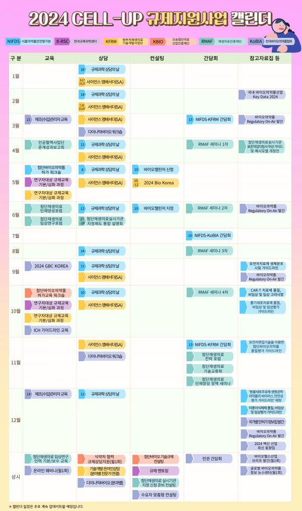 CELL-UP 캘린더에는 6개 기관이 2024년에 제공하는 교육, 컨설팅, 상담, 간담회 등 70개 사업 계획이 포함되어 있으며 주요 일정은 기관간 공동간담회 바이오챌린저 제조관리자 교육 연구자 대상 규제 교육 기본/심화 과정 등이다.