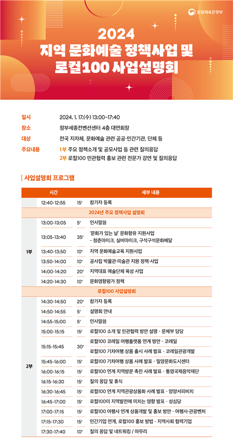 [AANEWS] 문화체육관광부는 1월 17일 오후 1시, 정부세종컨벤션센터 대연회장에서 전국 지자체와 민간 문화예술단체·기업 등을 대상으로 2024년에 추진하는 지역문화예술 정책사업과 ‘로컬100’ 사업을 설명하고 홍보 방안 등을 공유한다.