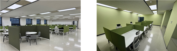 먼저, 부서 간 칸막이를 없애고 직위에 관계없이 책상 크기를 최소화해 여유공간을 마련해 공유와 협업 공간으로 재설계했다.