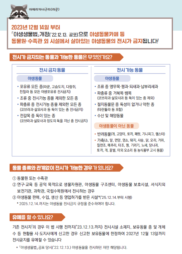‘야생생물법’ 개정으로 라쿤, 미어캣 등의 야생동물은 동물원과 같이 적정한 사육시설을 갖춘 시설에서 전시해야 하며 동물카페와 같은 시설에 대해서는 새로운 제도에 적응할 수 있도록 4년의 기간을 부여하면서 동물에게 스트레스를 주는 만지기, 먹이주기 등의 행위를 제한했다.