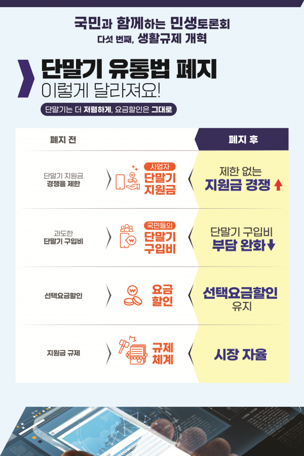정부는 통신사, 유통점간 자유로운 지원금 경쟁을 촉진하고 국민들이 저렴하게 휴대전화 단말을 구입할 수 있는 기회를 제공하기 위해 현행 ‘이동통신단말장치 유통구조 개선에 관한 법률’을 전면 폐지하기로 했다.