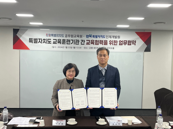 [AANEWS] 강원특별자치도 공무원교육원은 전북특별자치도 인재개발원과 1월 22일 강릉 세인트존스호텔에서 업무협약을 체결했다.