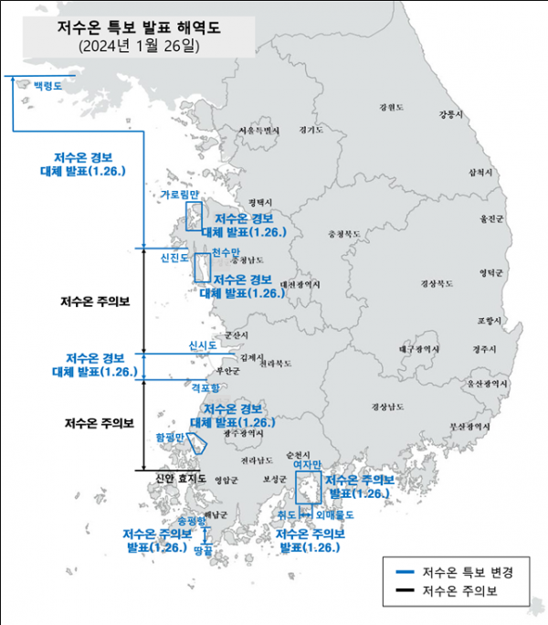 [AANEWS] 해양수산부는 국립수산과학원이 1월 26일 오후 2시부로 전남 남해 연안과 남해 내만에 저수온 주의보를, 서해 중남부 연안과 서해 내만에 저수온 경보를 각각 발표함에 따라 저수온 위기경보를 ‘경계’에서 ‘심각’ 단계로 상향했다.