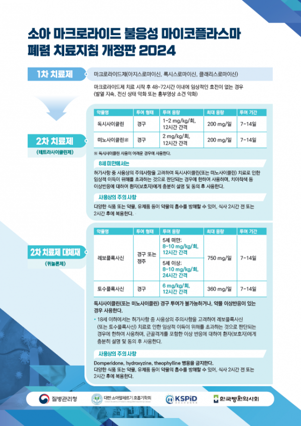 [AANEWS] 질병관리청은 대한소아알레르기호흡기학회, 대한소아감염학회, 한국병원약사회와 함께 최근 마이코플라스마 항생제 내성 및 임상 결과를 반영한 ‘소아 마크로라이드 불응성 마이코플라스마 폐렴 치료지침’을 마련하고 임상 현장 의료진을 대상으로 온라인 교육을 실시할 계획이라고 밝혔다.