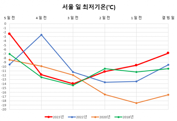 최근 5년간 한강이 결빙되기 전 5일 동안 서울의 일 최저기온과 일 최고기온을 분석해보면, 5일 이상 일 최저기온은 영하 10도 이하이고 일 최고기온도 영하에 머물 때 한강이 결빙되는 경향을 보였다.