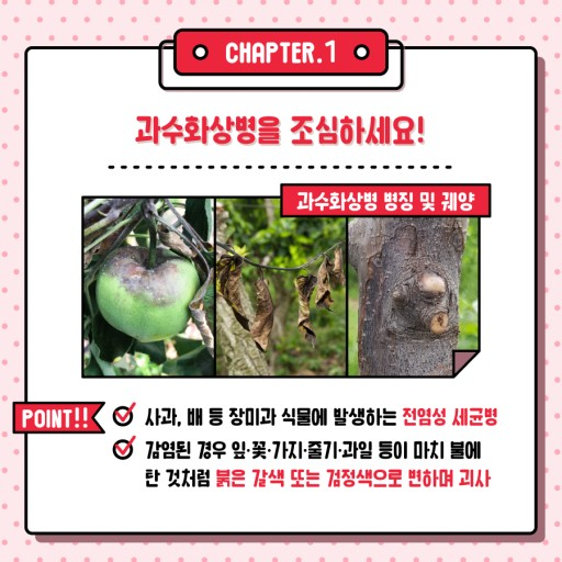 과수화상병은 세균에 의해 사과나 배나무의 잎·줄기·꽃·열매 등이 마치 불에 타 화상을 입은 듯한 증세를 보이다가 고사하는 병이다.