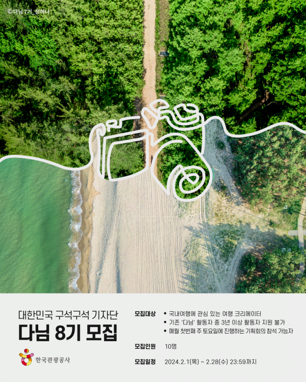 [AANEWS] 한국관광공사는 2024년 한 해 동안 국내 여행지를 취재하고 홍보할 대한민국 구석구석 기자단 ‘트래블리더’와 ‘다님’을 1~2월 중 모집한다.