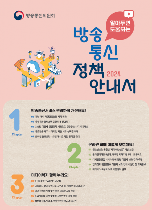 정책안내서는 방송통신서비스 편리하게 개선돼요 온라인 피해 이렇게 보호해요 미디어 복지 함께 누려요 등 세 가지 주제로 나누어 총 15개의 정책을 담았다.