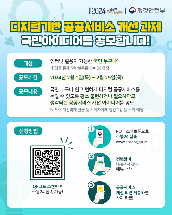 인터넷 활용이 가능한 국민 누구나 참여가능하며 소통24에 게시된 ‘디지털기반 공공서비스 개선을 위한 아이디어 공모’ 조사에 의견을 제출하면 된다.
