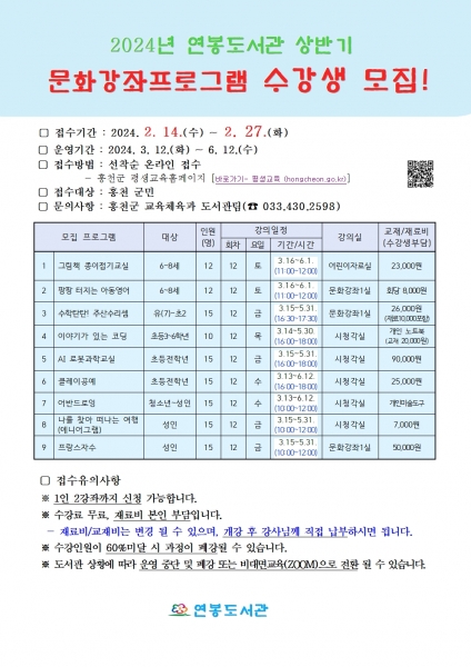 [AANEWS] 홍천연봉도서관이 2024년 상반기 문화강좌 수강생을 모집한다.