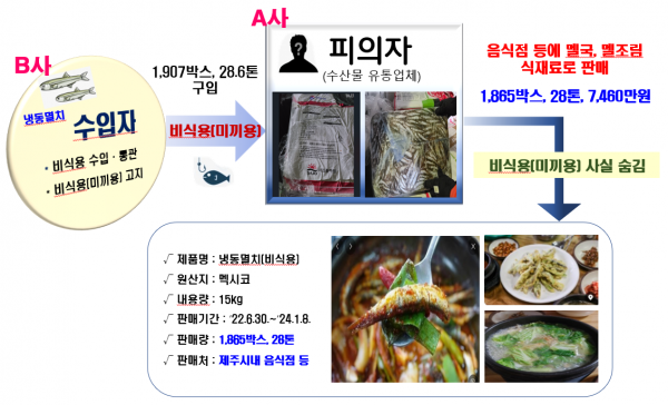 수사결과, 수산물 유통업체 A사는 2022년 6월경 국내 식용 멸치의 공급이 부족해지자 경제적 이득을 취하기 위해 수입업체 B사로부터 비식용 냉동멸치를 구매한 후, 음식에 사용하는 식용 멸치로 둔갑시켜 제주 시내 일반음식점 등에 판매했다.