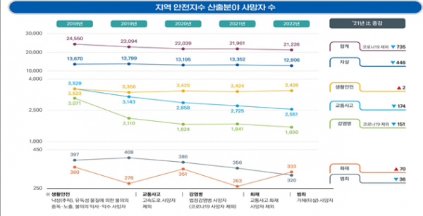 [AANEWS] 행정안전부는 2022년 통계를 기준으로 교통사고 화재, 범죄, 생활안전, 자살, 감염병 등 6개 분야의 지방자치단체의 안전역량을 나타내는 2023년 지역 안전지수를 공표했다.