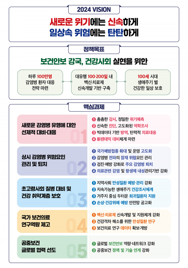 5개의 핵심과제와 17개의 세부과제를 중심으로 새로운 감염병에 대비하고 상시감염병과 만성질환, 건강위해요인의 예방·관리체계 구축, 국내·외 보건의료 역량 제고를 추진하고