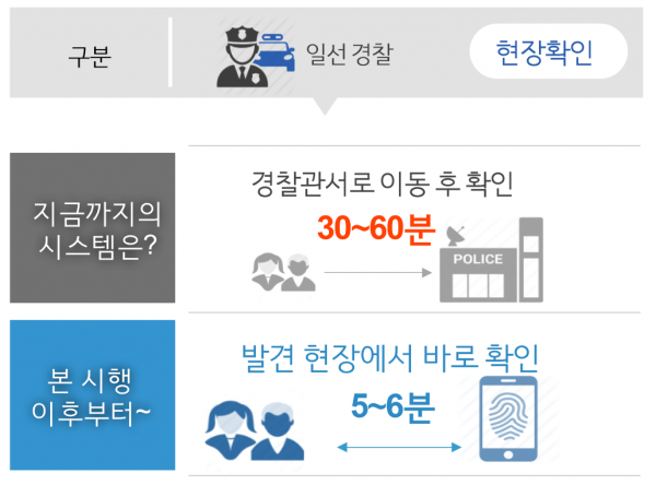 종전에는 치매 노인, 주취자 등의 구호대상자를 발견하면 신원확인을 위해 고정식 신원확인 시스템이 비치된 인근 지구대·파출소까지 이동해야 함에 따라 대상자의 인적사항을 확인하는데 최소 30분에서 1시간이나 소요됐다.