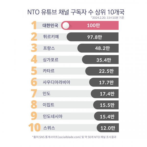 이는 2020년 3월 구독자 수 10만명을 돌파하며 ‘실버버튼’을 수상한 후, 4년 만에 이룬 쾌거이며 전 세계 NTO 중 최초의 기록이다.