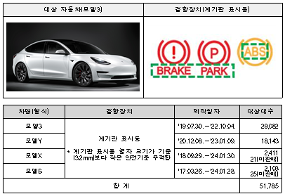 모델3 등 4개 차종 51,785대는 계기판 표시등 글자 크기가 기준 보다 작아 안전기준 부적합으로 모델X 등 2개 차종 852대는 후방카메라 소프트웨어 오류로 각각 2월 21일부터 시정조치에 들어간다.