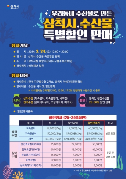 시 관계자는 “전국 최대 삼척정월대보름제 행사와 연계해 관광객과 시민들에게 신선한 지역 수산물을 저렴한 가격으로 구매하고 시식 체험의 기회를 드리고자 행사를 진행하게 됐으며 본 행사를 통해 지역 수산물을 적극 홍보해 지역 어업인의 소득에 많은 도움이 될 수 있도록 추진하겠다”고 전했다.