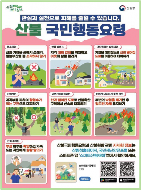 건조하고 강한 바람이 부는 봄은 산불 발생 위험이 높아지는 시기로 산이나 산과 가까운 곳에서의 안전수칙 준수가 무엇보다 중요하다.