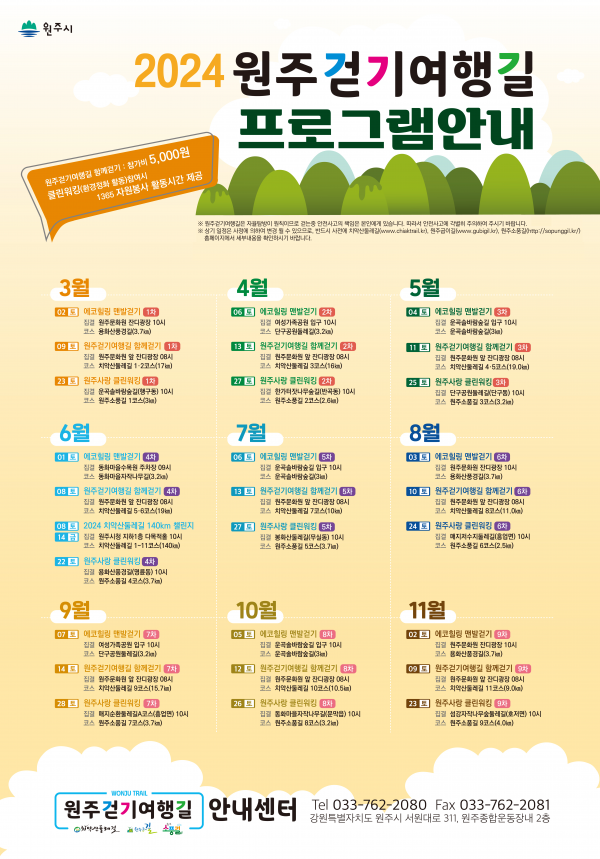 이어 8월에는 ‘제20회 원주사랑걷기대행진’, 10월에는 ‘제30회 원주국제걷기대회’를 개최하며 명실상부 국내 최고의 걷기 운동 메카로 거듭난다는 방침이다.